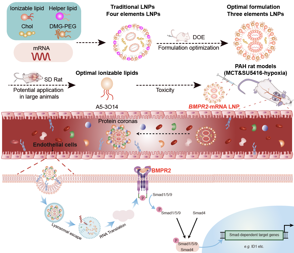 圖:荷載BMPR2 mRNA的肺內(nèi)皮細(xì)胞靶向LNP構(gòu)建示意圖及其在肺動(dòng)脈高壓治療中的應(yīng)用。
