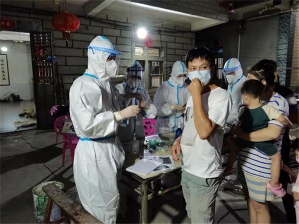 林健華(右一),仙游工作站行政管理專業學生,石蒼鄉濟川村支部書記,在組織村民進行核酸檢測。