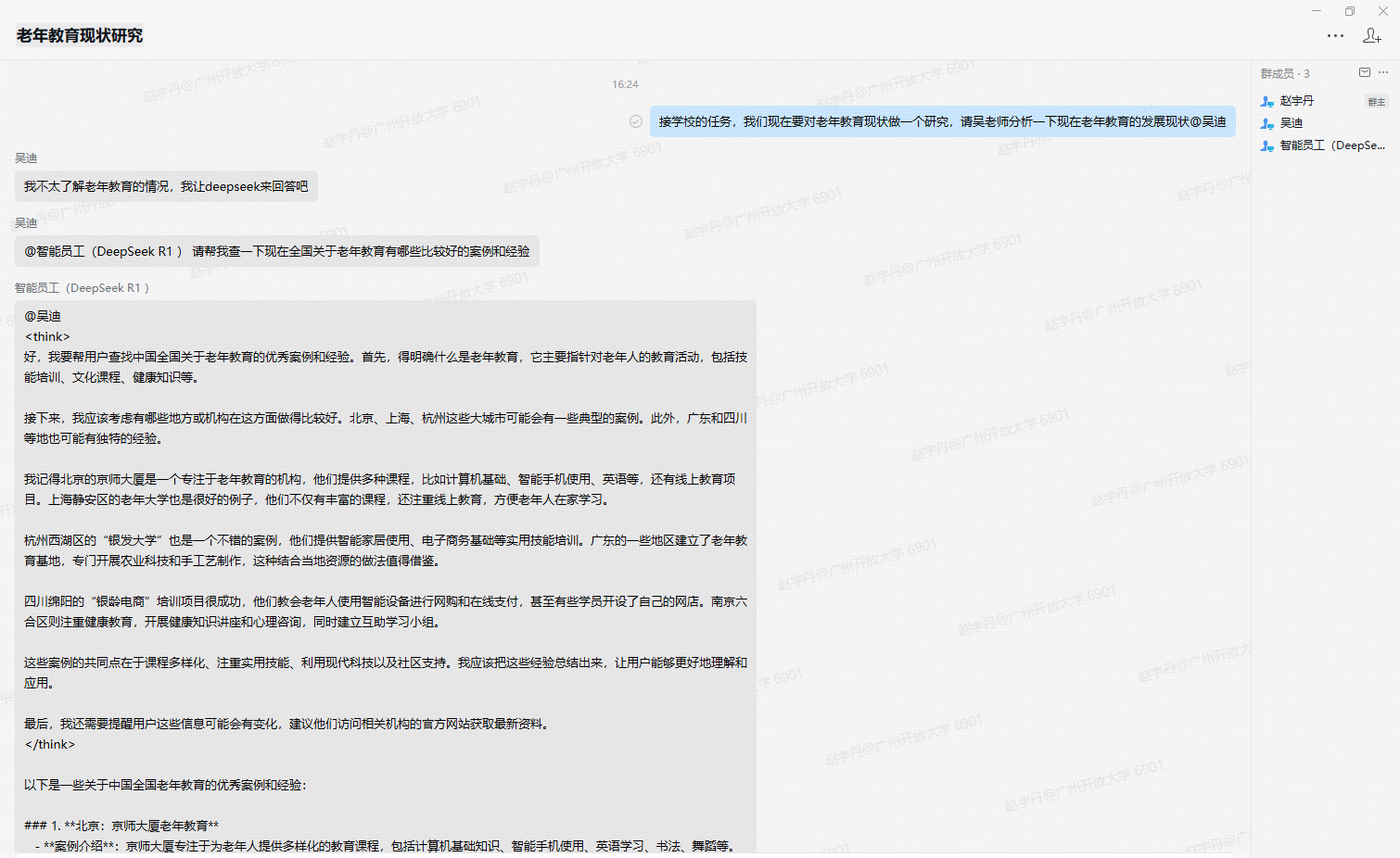 DeepSeek智能員工不僅能夠精準回應各類問題,還能作為工作助手加入到工作討論中,在企業微信群組,智能員工參與工作討論與協作,為教職工提供實時、高效的輔助支持。它如同每一位教職工的私人秘書,助力提升工作效率,優化工作流程,推動校園管理的智能化升級。