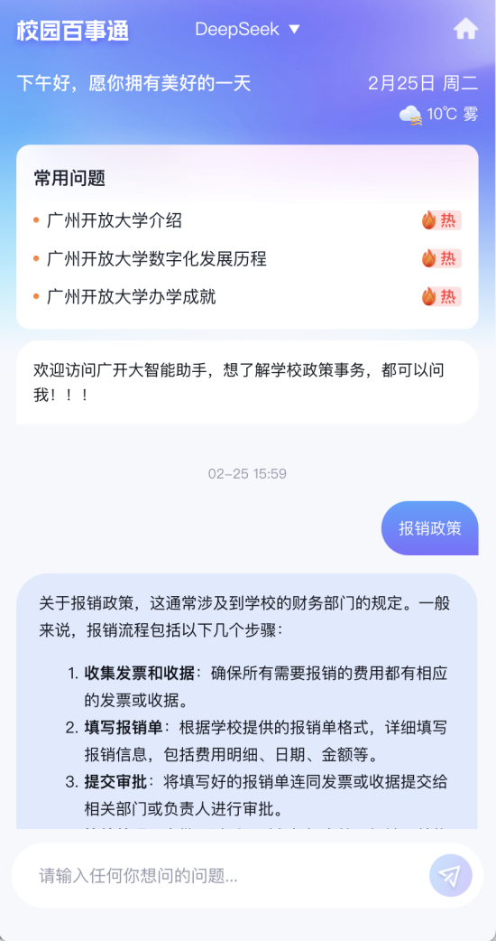 在數字化轉型與教育創新的浪潮中,廣州開放大學始終致力于探索前沿技術在教育領域的深度應用。2025年,廣州開放大學已成為全國開放大學體系中首批成功實現校內自主部署 DeepSeek 的院校之一。這一創新實踐不僅標志著我校在人工智能應用領域的重大突破,更為全校師生帶來了前所未有的智能化體驗,為校園管理與教育教學注入了強大動力。