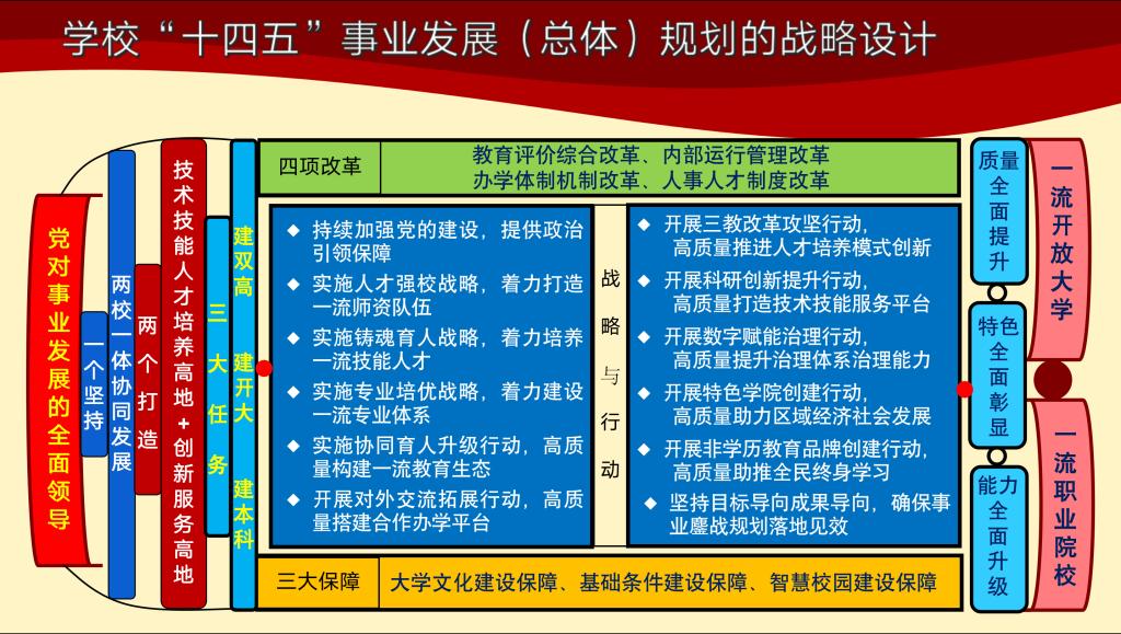 面向“十四五”,學校事業發展整體路徑是“一個堅持、兩個打造、三項任務、四維推進”。“十四五”期間,學校將堅持“兩校一體”協同發展,以打造技術技能人才培養高地、打造創新服務高地為核心,全面落實建“雙高”、建“開大”、建“本科”三大戰略任務,推進創新優勢打造、人才培養體系、開放辦學格局、事業發展保障四向維度,建設“互聯網+”國內一流開放大學、一流職業院校。