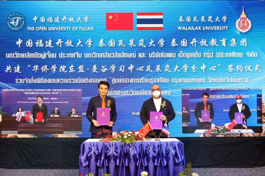 儀式上,福建開放大學與泰國開放教育集團簽署《福建開放大學華僑學院東盟—曼谷學習中心戰(zhàn)略合作協(xié)議》,并與瓦萊嵐大學簽署三方合作備忘錄。Phinij Jarusombat、Prakob Rattanapan、Patcharinruja Juntaronanont、Suttikorn Jearpaitoon、Voravuth Somsak、趙明光在泰國會場為福建開放大學華僑學院東盟-曼谷學習中心及瓦萊嵐大學分中心揭牌,在中國會場的嘉賓遠程在線見證了這一時刻。