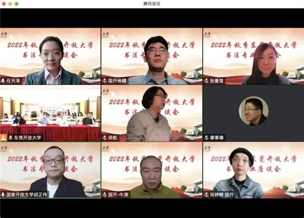 10月15日上午,東莞開放大學(xué)舉辦首屆書法專業(yè)座談會。活動采取“線上線下”相結(jié)合的方式,國家開放大學(xué)人文教學(xué)部副部長胡正偉、藝術(shù)學(xué)院副院長任天淳、書畫藝術(shù)教育研究院常務(wù)副院長唐應(yīng)山、藝術(shù)教育中心副主任徐航、書法專業(yè)主持教師牛濤、張曼瑩、楊耀、肖婷婷等在北京以線上直播方式參加會議,東莞開放大學(xué)副校長張念偉、教務(wù)處主任廖繼標(biāo)、美術(shù)教育中心主任喻涌波、首屆書法專業(yè)本科班班主任張靈老師及全體同學(xué)在主會場參加會議。