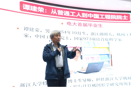 譚建榮分享了年輕時的學習、工作經歷,介紹自己出生于動蕩年代,初中畢業后因特殊時期“求學無門”,做了15年的技術工人,在中央廣播電視大學開始招生之時,把握住彌足珍貴的機會,成為電大的首屆學生。三年時間里他一口氣修完機械工程和電子工程兩個專業的課程。“不斷學習和不斷提高是人生永恒的主題”,他說,電大課堂上樹立起來的求實學風對他有著深遠影響。譚建榮以蘇步青、華羅庚等科學家的人生經歷詮釋了實事求是的科研態度;用諸葛亮的《誡子書》和王國維的《人間詞話》,叮囑在場師生們在生活和學習中要肯努力、肯勤奮、肯吃苦,以創新和拼搏精神贏得出彩人生。譚院士結合自身經歷,旁征博引,從不同的角度與層次闡述了自己對終身學習的理解,引起現場師生的強烈共鳴和深刻思考。