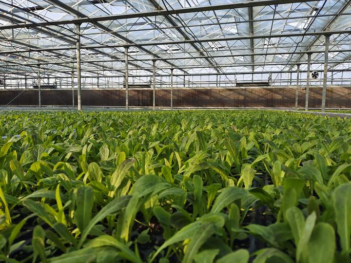 現代化的溫室大棚、智能化的灌溉設備、綠油油的蔬菜……與外面的濕冷不同,吉園農業種植基地給人“春意盎然”的活力感?!艾F在外面溫度大概10度左右,大棚里20多度,比外面要高10多度。這個季節種植的是萵筍,很快就要種西瓜。”辛宏權說。