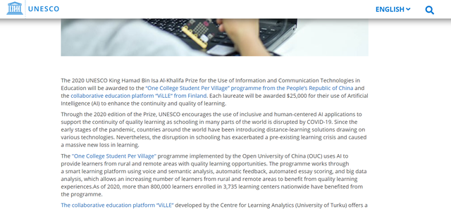 聯(lián)合國教科文組織教育信息化獎主要獎勵將信息通信技術應用于教育和教學領域并作出突出貢獻的個人、機構和非政府組織。2020年,該獎項的主題是利用人工智能保障學習的連續(xù)性和質量。