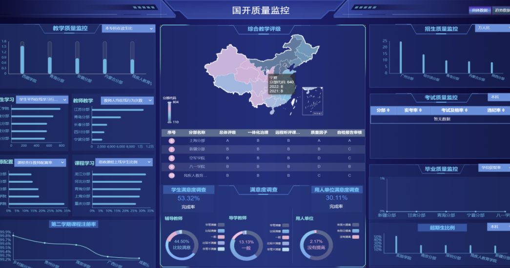 自2023年以來,學(xué)校數(shù)字化部聯(lián)合教務(wù)部、質(zhì)量監(jiān)控部、學(xué)習(xí)資源部、改革發(fā)展處/科研處、實(shí)驗(yàn)學(xué)院等業(yè)務(wù)部門,充分調(diào)研總部及分部的“數(shù)據(jù)驅(qū)動(dòng)教學(xué)改革”需求,統(tǒng)籌設(shè)計(jì)了數(shù)據(jù)駕駛艙系統(tǒng)。該系統(tǒng)包括學(xué)校主艙及招生、教務(wù)、教學(xué)、考試、課程、科研、質(zhì)量監(jiān)控等7大業(yè)務(wù)模塊的257個(gè)業(yè)務(wù)分析指標(biāo),其中招生32個(gè)、教務(wù)29個(gè)、考務(wù)48個(gè)、教學(xué)33個(gè)、科研17個(gè)、課程資源34個(gè)、質(zhì)量監(jiān)控64個(gè)。數(shù)據(jù)駕駛艙系統(tǒng)實(shí)現(xiàn)了跨地域、跨層級、跨機(jī)構(gòu)提供數(shù)據(jù)服務(wù)、業(yè)務(wù)管控及異常值預(yù)警等功能,是數(shù)據(jù)驅(qū)動(dòng)教學(xué)改革的典型應(yīng)用。