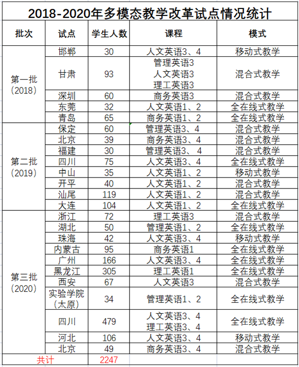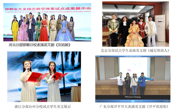 2017-2021年,外語教學部基于目標導向、問題導向和效果導向,從學科特點出發,以“多模態教學”理念為支撐,充分利用信息化手段,在國開體系16家分部、學院,共24家單位開展多模態教學改革試點,開放教育大學英語多模態教學體系建設初見成效。