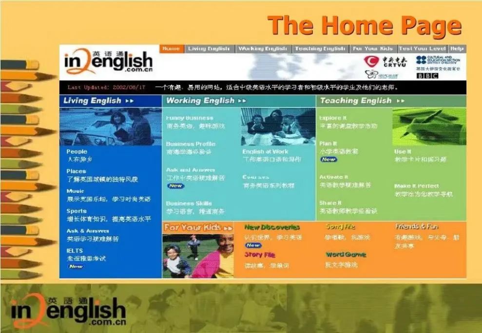 與英國文化協會、英國廣播公司(BBC)聯合開發了包括生活英語、商務英語和兒童英語等欄目的“英語通(In2English)”平臺。注冊用戶近13萬人,訪問量達上億人次,月均瀏覽量100多萬次,訪問次數月均為30多萬人次,媒體下載量月均為200多萬次。被英國布里斯托大學和倫敦大學用作學術研究基地。