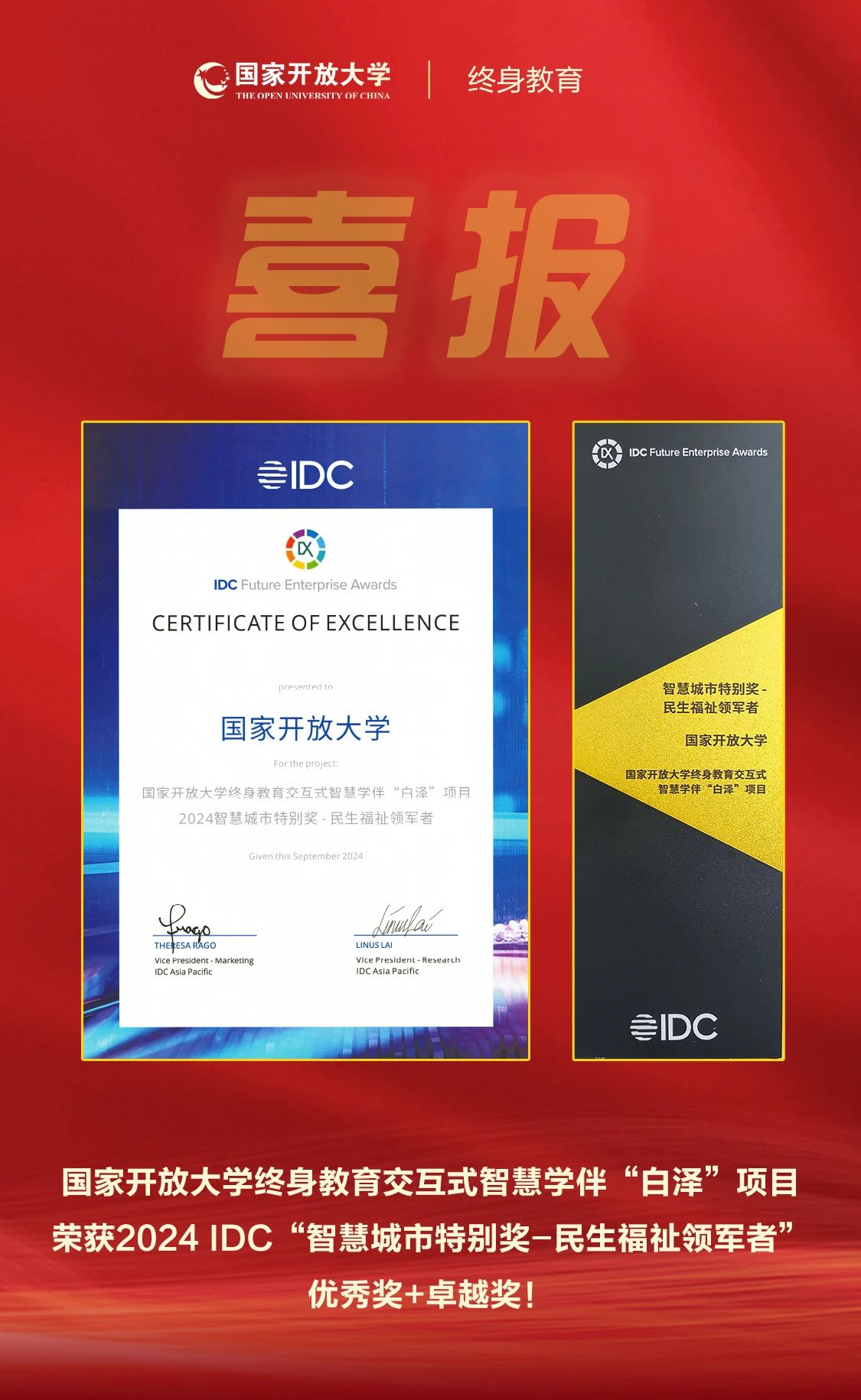 近期,全球權威IT市場研究和咨詢公司IDC(International Data Corporation)公布了“2024 IDC中國未來企業大獎”獲獎名單,智慧學伴“白澤”項目榮獲“智慧城市特別獎-民生福祉領軍者”優秀獎和卓越獎。本次獲獎是對國家開放大學推進人工智能技術賦能學習型社會建設成效的肯定。
