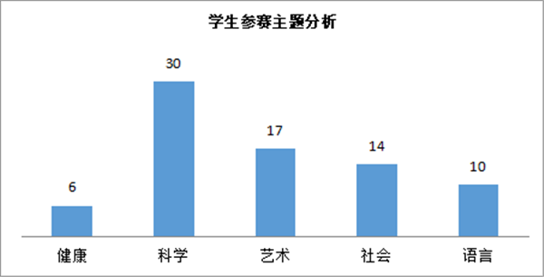 在參賽主題上,均來自幼兒園五大領(lǐng)域的教育活動,其中有39%的學生選擇了科學領(lǐng)域的活動,22%的學生選擇了藝術(shù)領(lǐng)域的活動,18%的學生選擇了社會領(lǐng)域的活動,13%的學生選擇了語言領(lǐng)域的活動,8%的學生選擇了健康領(lǐng)域的活動。