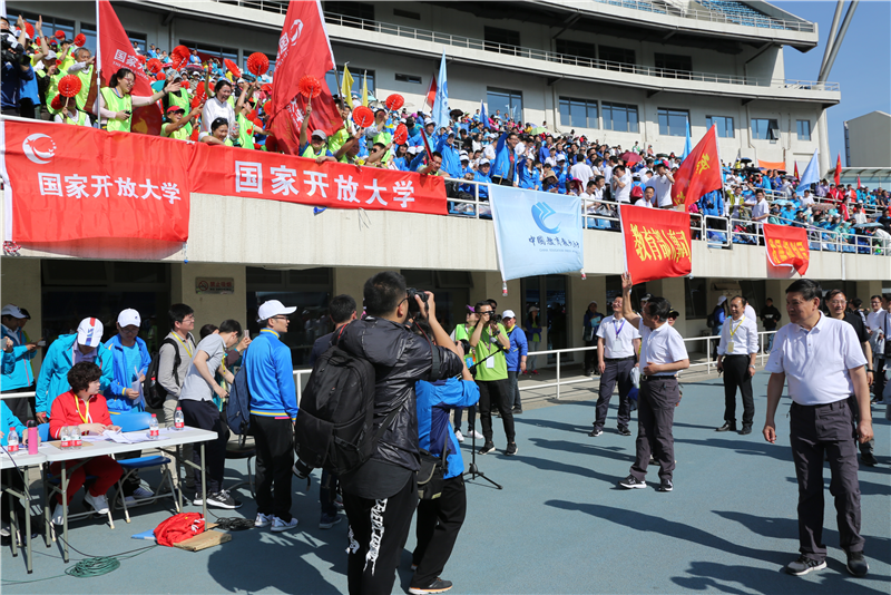 國家開放大學代表隊走過出席臺接受檢閱。“終身學習,追逐夢想,開放大學,再創輝煌。”4月29日,教育部第十屆職工運動會在北京奧體中心舉行,國家開放大學取得團體總分第四名的優異成績,并獲得組織獎。國家開放大學教職工賽場上奮勇拼搏、團結協作,賽場下組織有序、秩序井然,展現了學校良好的精神風貌。