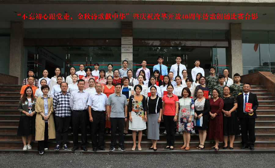 為貫徹和落實黨的十九大精神,培育和踐行社會主義核心價值觀,豐富校園文化生活,11月16日,廣州電大舉行“成功之路夢想起航”素質教育系列活動之“不忘初心跟黨走,金秋詩歌獻中華”暨慶祝改革開放40周年詩歌朗誦比賽。來自廣州電大系統9個教學單位的20支參賽隊伍近40位同學參加比賽。黨委副書記陳雪曼以及相關部門負責人,系統各單位教師和學生共100余人現場觀摩比賽。