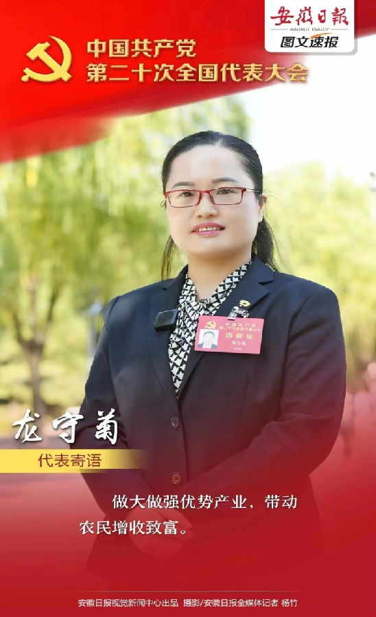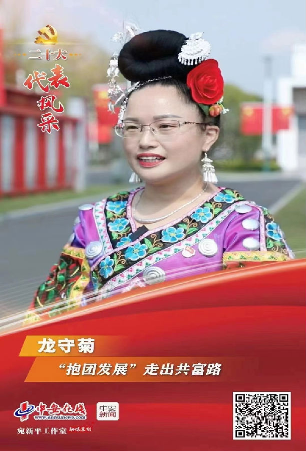 人物簡介:龍守菊,侗族,中共黨員,黃山開放大學2019年秋季“一村一名大學生”農業經濟管理專業學員,安徽省黃山市黃山區烏石鎮烏石村黨總支委員、村委委員,黃山徽黔種養專業合作社理事長,曾獲全國民族團結進步模范個人,安徽省“三八”紅旗手,安徽省“最美巾幗脫貧攻堅人”,黨的二十大代表。