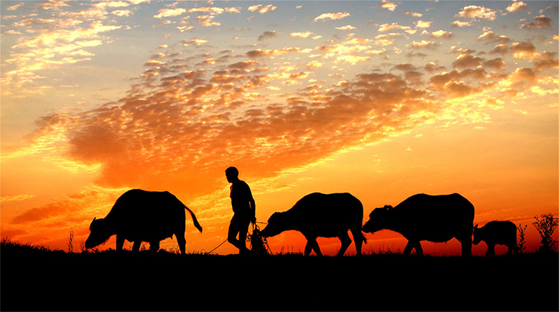 “落日瞬間”美景與“放牛人”勞作之美形成一道美麗的風景線。