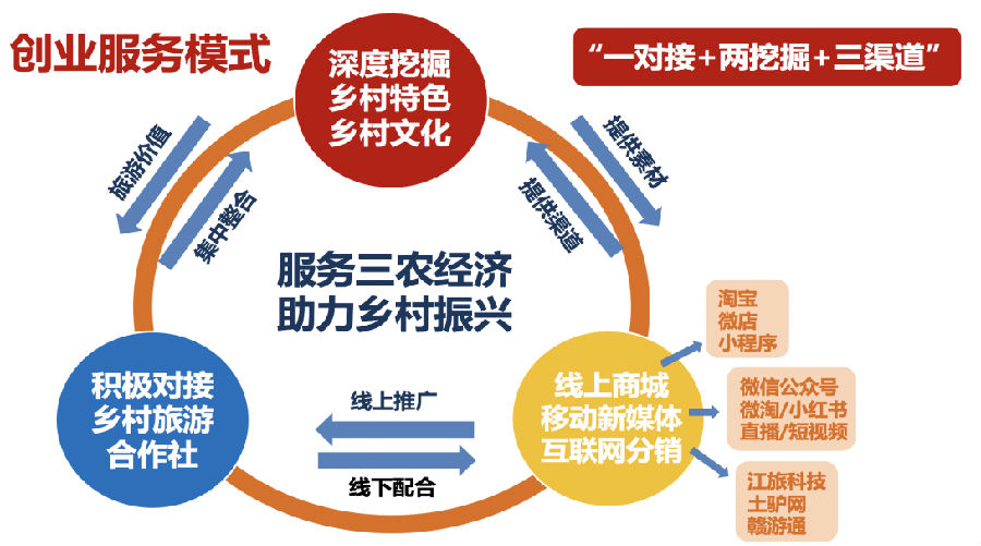 在對長溪村的項目培育過程中,陳亞薇帶領的團隊決定以鄉村文化為發展視角,以鄉村特色和文化為立足點,采用“一對接+兩挖掘+三渠道”的幫扶模式,即積極對接鄉村旅游合作社,深度挖掘鄉村獨有特色和文化,通過線上商城、移動新媒體、互聯網分銷三大渠道,打造線上鄉村文化爆點和鄉村特色IP,實現國家大力提倡的“一村一品,一村一韻”新農村建設,引流線上粉絲至實地旅游和打卡消費,以鄉村旅游同時帶動相關農產品和文化衍生品的銷售,最終實現農民提質增收、鄉村文化傳承與鄉村振興的多方共贏效應。