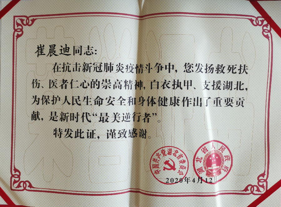 在武漢方艙醫(yī)院的42個(gè)日日夜夜,她每天都在忙碌中度過,裹著密不透風(fēng)的防護(hù)服,穿梭在病房中,解答患者問題,幫患者排憂解難,帶領(lǐng)患者跳新疆舞消除焦慮情緒……每當(dāng)患者們得知她是從新疆來的時(shí)候,總會(huì)很抱歉地說道:“新疆那么遠(yuǎn)都來幫助我們,武漢給全國(guó)人民添麻煩了。”而崔晨迪也總會(huì)安慰他們:“全國(guó)各族人民一家親,一方有難,八方支援,只要你們好,我們就好!”崔晨迪和同事們每天都在與時(shí)間賽跑,與病毒做斗爭(zhēng),和死神搶人,終于不辱使命,戰(zhàn)勝了病毒,順利完成了任務(wù)。