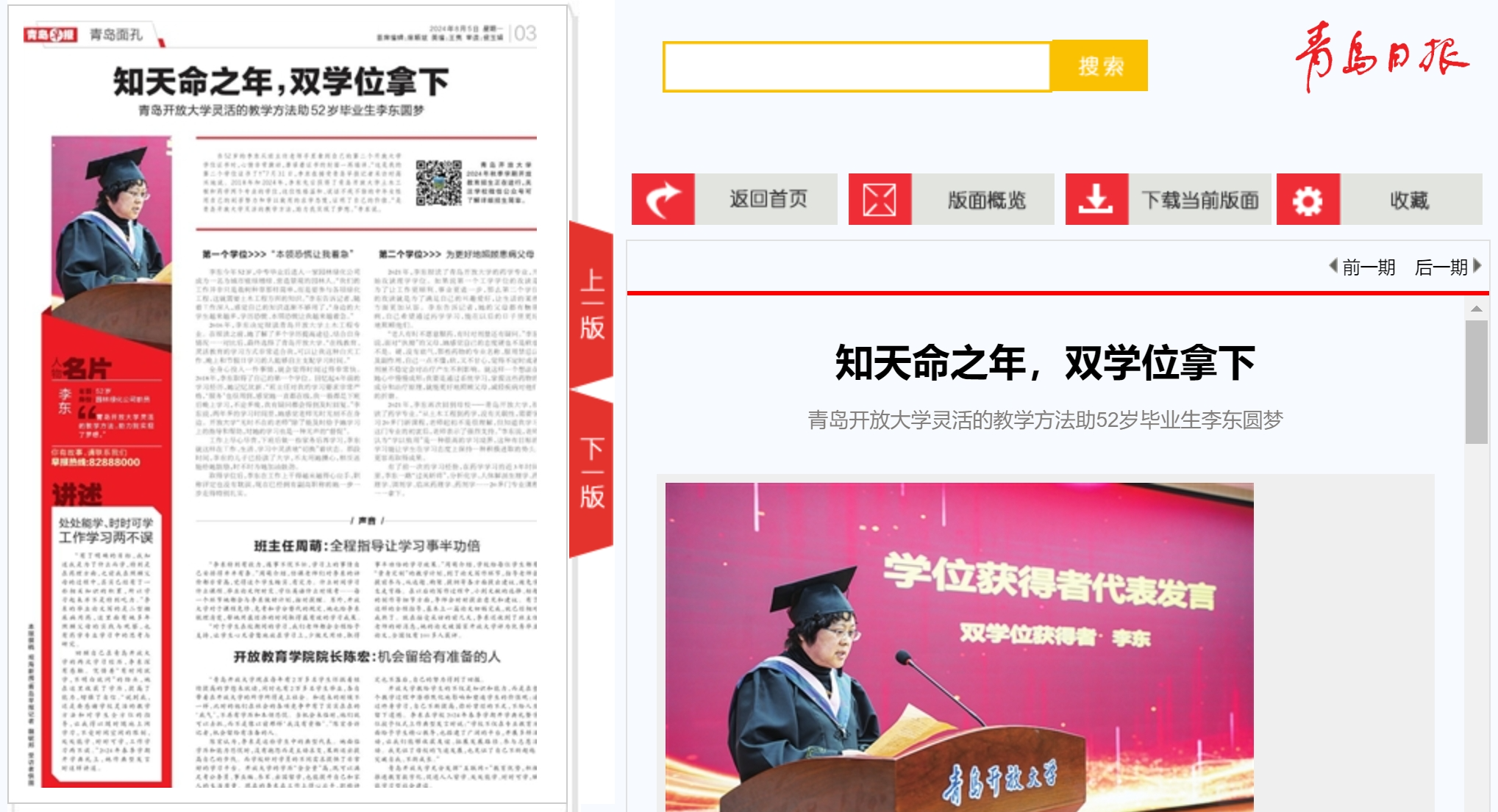 當52歲的李東從班主任老師手里拿到自己的第二個開放大學學位證書時,心情非常激動,摩挲著證書的封面一再端詳。“這是我的第二個學位證書了!”7月31日,李東在接受青島早報記者采訪時高興地說。2018年和2024年,李東先后獲得了青島開放大學土木工程和藥學兩個專業的學位,這位性格溫和、說話不疾不徐的中年女性用自己的刻苦努力和學以致用的求學態度,證明了自己的價值。“是青島開放大學靈活的教學方法,助力我實現了夢想。”李東說。