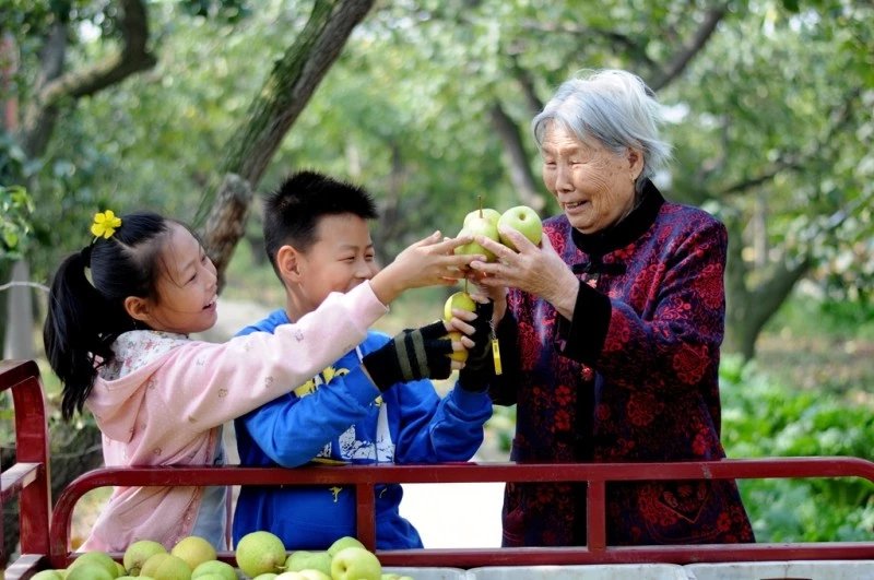 這幅作品是在豐收時節,孩子們給忙碌了一年的老奶奶獻上最甜的梨子。