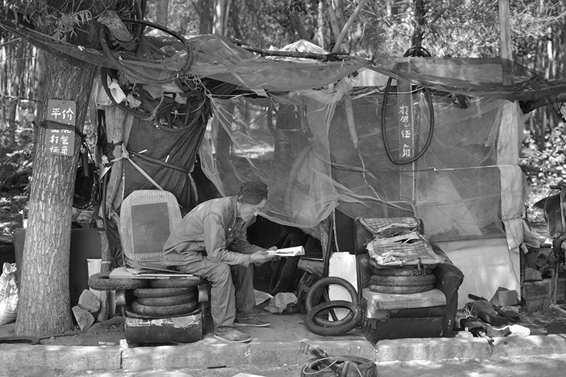 作品拍攝的是一位修自行車的大爺利用閑暇全神貫注地學習。生活不易,幾個自行車胎磊成座椅,幾根樹枝、幾塊幔帳搭起教室;街邊車輛往來,書上鳥飛蟲鳴,身處鬧市卻沉浸在書的海洋,大爺的學習精神深深地觸動了我。