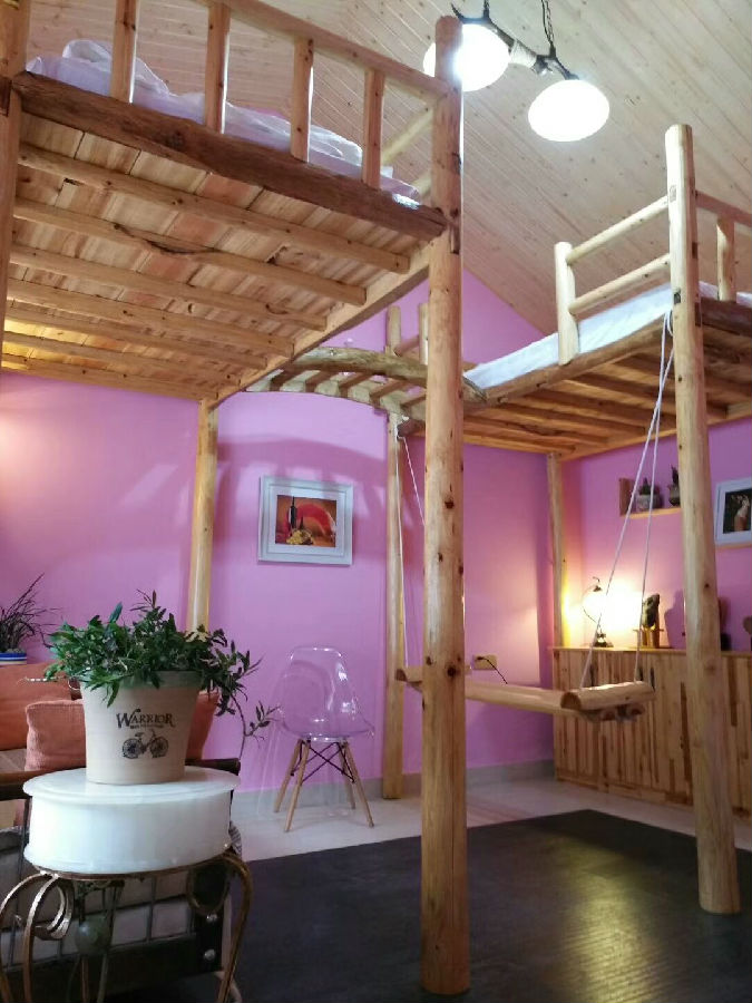 走進禾飄香,3層半的民樓,層層有特色、間間不一樣。有海洋,有森林,有木屋,有日式閨蜜房、浪漫情侶房、卡通家庭房等。二樓主間內,老板更是將其妻子的嫁妝全部擺上櫥柜,溫馨堪比婚房。頂層的民宿風采和鵲橋相會兩間房最具特色,全是木制裝飾,其中一間的裝飾全部是洪和漂就地取材手工制作,木制酒架充滿了人性化設計,床頭的燈架也是上山尋來的“緣來之木”。另外一間是頗有名氣的情侶房“鵲橋相會”,房間里的兩張床都在上鋪,床與床之間是一座彎曲的木制小橋,“鵲橋相會”由此得名。