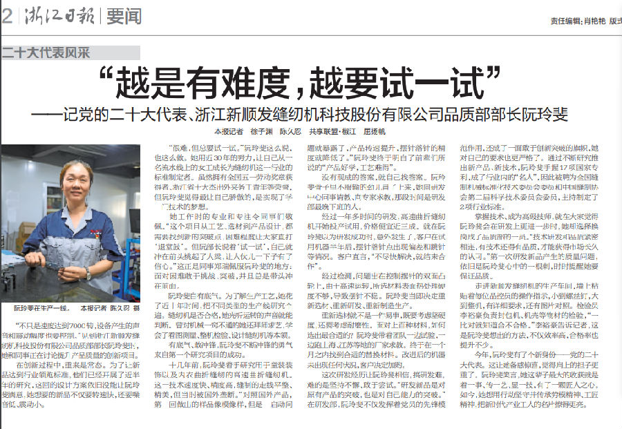 10月6日,《浙江日報》2版要聞版刊發了《“越是有難度,越要試一試”——記黨的二十大代表、浙江新順發縫紉機科技股份有限公司品質部部長阮玲斐》一文,對黨的二十大代表阮玲斐進行宣傳報道。現將全文刊登如下: