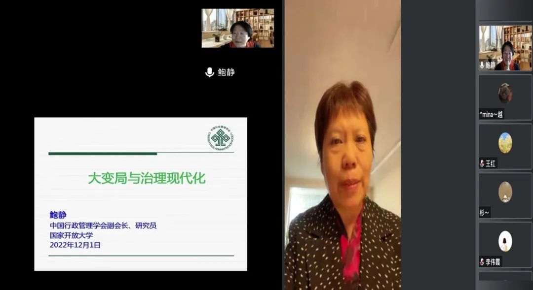 為深入學習黨的二十大精神,提升國家開放大學行政管理學科建設水平和教育教學質量,政法教學部于2022年12月1日邀請中國行政管理學會副會長鮑靜研究員為辦學體系師生開展題為“大變局與治理現代化”的專題講座,國家開放大學紀委書記、黨委副書記劉向虹出席講座并致辭,活動由國家開放大學政法教學部支部書記、副部長袁松鶴主持。