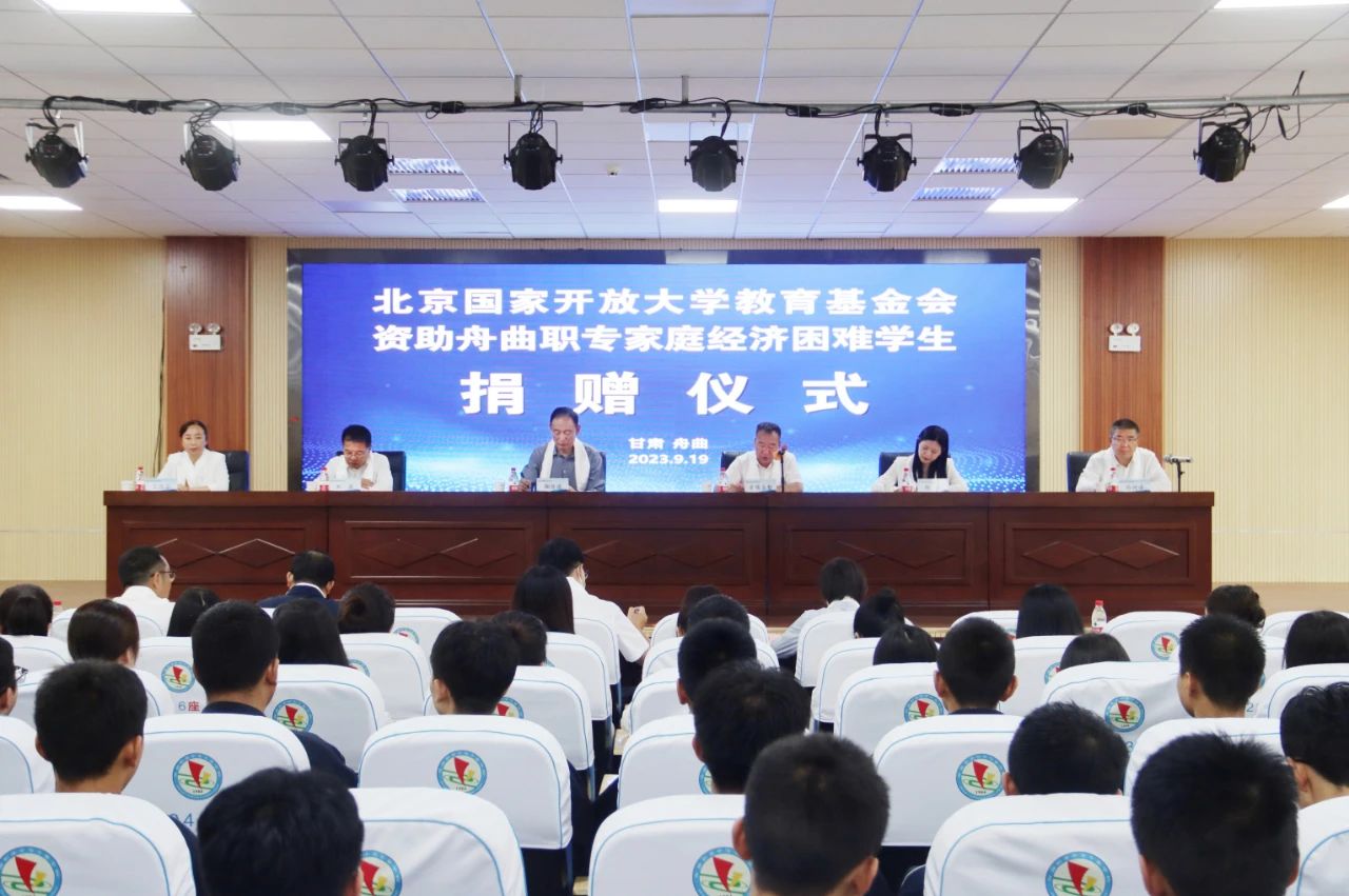 9月19日,國家開放大學教育基金會資助舟曲職業中等專業學校家庭經濟困難學生捐贈活動在甘肅省舟曲縣舉行。國家開放大學教育基金會理事長鞠傳進、秘書長鄭潔,舟曲縣委書記才項當智,中組部駐舟曲幫扶工作組組長、舟曲縣委副書記劉源,舟曲縣委副書記王添芬出席活動。活動由舟曲縣委常委、常務副縣長楊樹峰主持,舟曲縣教育局局長王海平,舟曲職業中等專業學校校長李維鈞及該校領導班子、中層干部、二年級全體師生參加活動。