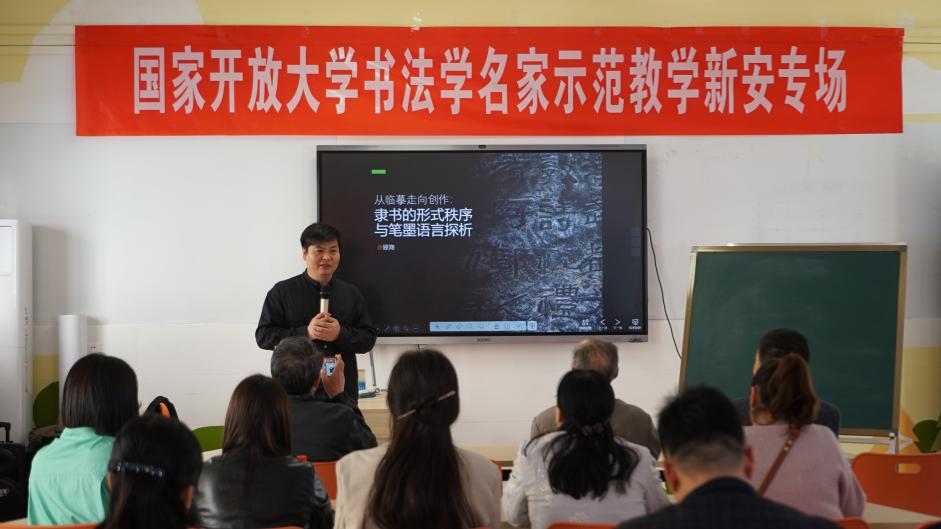 教學觀摩環節,河南省書協副主席張青山、鄭州大學書法學院教授顧翔在新安開放大學為60余名書法學專業學員傳經送寶、示范教學,專業教師現場觀摩。兩位名家結合各自學書心得,從如何高效學習書法講起,圍繞選帖、臨帖、筆法結構解析、章法布局、藝術表達、參展參賽等方面展開實操指導,為一線教師提供教學范式。與會教師紛紛表示,教學觀摩活動有效增強了書法學線下課程的專業感染力與藝術表現力。