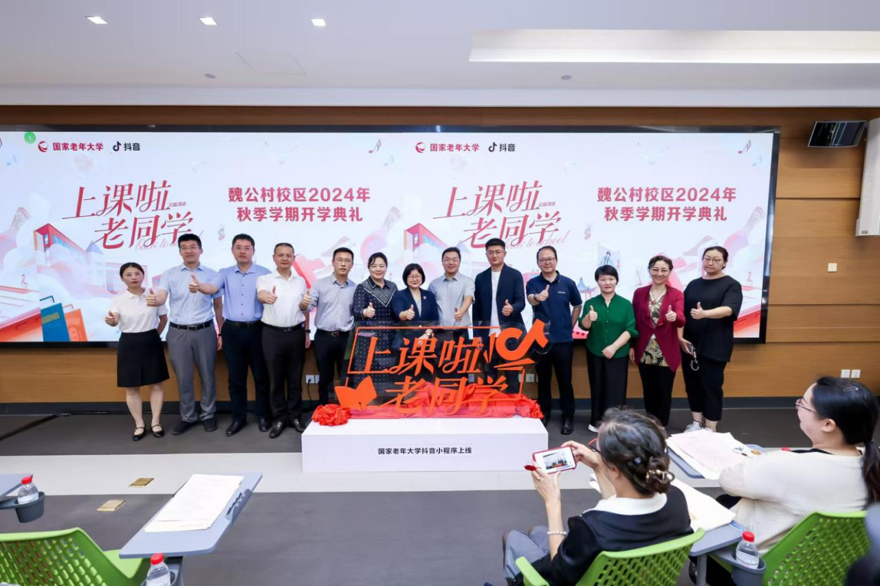 9月12日,國家老年大學魏公村校區舉辦2024年秋季學期開學典禮。國家開放大學(國家老年大學)黨委委員、副校長范賢睿,抖音集團政務運營總經理王博出席活動,共同啟動“上課啦,老同學”公益活動。抖音集團相關業務負責人,國家開放大學外語學院、中職學院、實驗學院、組織部/人事處、財務處、后勤保衛處、國家老年大學各處室負責人與魏公村校區50余名師生參加活動。活動由國家老年大學直屬學院院長劉彩梅主持。