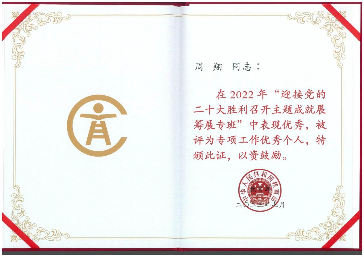 國(guó)家開放大學(xué)學(xué)習(xí)資源部(數(shù)字圖書館)周翔,因在2022年“迎接黨的二十大勝利召開主題成就展籌展專班”中表現(xiàn)優(yōu)秀,被教育部評(píng)為專項(xiàng)工作優(yōu)秀個(gè)人。
