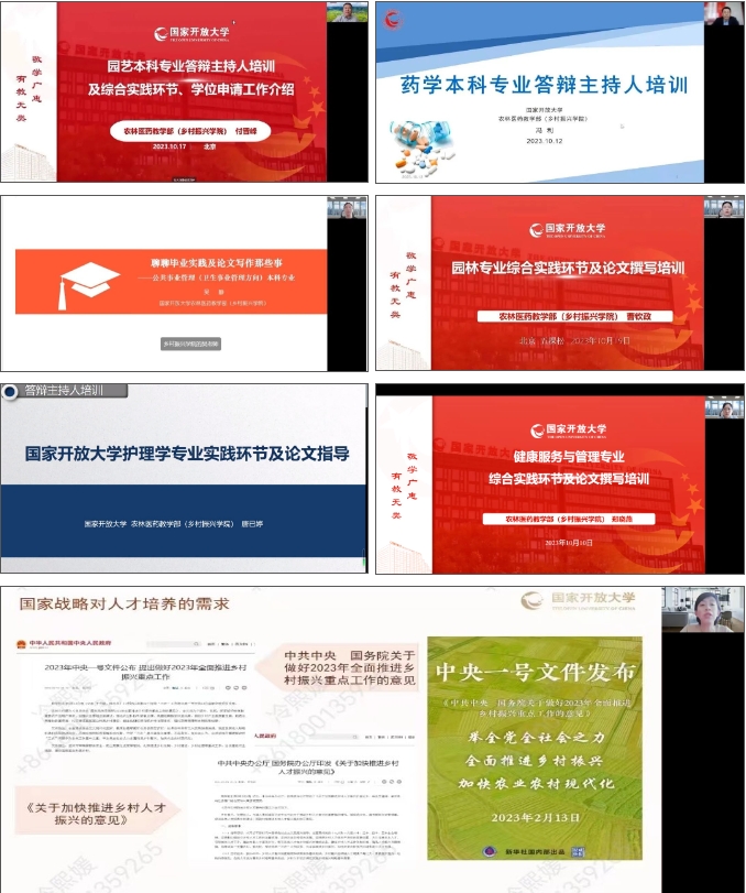 為全面學(xué)習(xí)貫徹黨的二十大精神,落實《國家開放大學(xué)2023年工作要點》,加強辦學(xué)體系農(nóng)醫(yī)類專業(yè)教師隊伍建設(shè),提升學(xué)生畢業(yè)論文指導(dǎo)和答辯工作水平,提高教學(xué)質(zhì)量,國家開放大學(xué)農(nóng)林醫(yī)藥教學(xué)部(鄉(xiāng)村振興學(xué)院)于9月至10月舉辦了農(nóng)醫(yī)科類本科專業(yè)答辯主持人線上培訓(xùn)。培訓(xùn)重點圍繞農(nóng)醫(yī)類專業(yè)畢業(yè)綜合實踐環(huán)節(jié)及學(xué)位授予相關(guān)要求,畢業(yè)論文和學(xué)位論文選題、撰寫及答辯要求,以及答辯主持人的任務(wù)與要求等內(nèi)容開展,培訓(xùn)形式主要包括專家講座、專業(yè)培訓(xùn)和分享交流等。來自總部和36個分部(學(xué)院)的184名教師參加。綜合資格審查結(jié)果、作業(yè)及學(xué)習(xí)完成情況,共162人次獲得答辯主持人證書。即將開展畢業(yè)綜合實踐和畢業(yè)論文寫作的相關(guān)專業(yè)學(xué)生也參加了此次培訓(xùn)。208人次觀看直播培訓(xùn),458人次回看培訓(xùn)視頻。