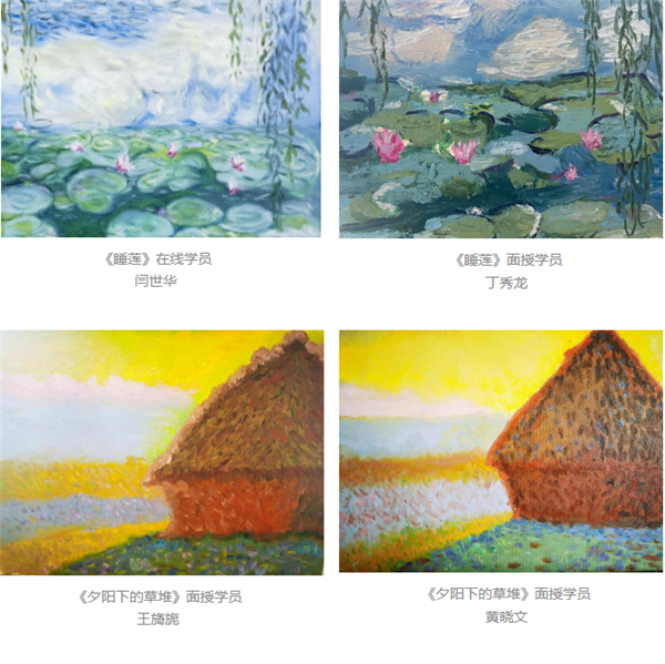 “零基礎(chǔ)油畫(huà)”線(xiàn)上線(xiàn)下融合班學(xué)員在學(xué)習(xí)期間學(xué)習(xí)了畫(huà)家思維的核心知識(shí),臨摹了梵高的《鳶尾花》,莫奈的《潮汐》、《睡蓮11》及《夕陽(yáng)中的干草堆》四幅作品。短短6周,學(xué)員們從油畫(huà)小白成為能夠臨摹大師名作的油畫(huà)高手。看著自己的作品,學(xué)員們感嘆融合班激發(fā)了他們的藝術(shù)潛力。部分學(xué)員作品還將在東盟經(jīng)濟(jì)文化交流中心的“在線(xiàn)油畫(huà)公社”作品展上展出。