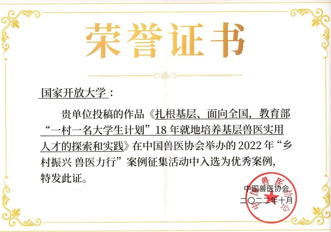為貫徹落實鄉村振興戰略,鞏固拓展脫貧攻堅成果,助力鄉村振興,中國獸醫協會組織開展了2022年“鄉村振興 獸醫力行”案例征集活動,面向畜牧獸醫相關從業人員及企事業單位征集參與鄉村振興的案例。經過專家嚴格評審和遴選,由國家開放大學提交的《扎根基層、面向全國,教育部“一村一名大學生計劃”18年就地培養基層獸醫實用人才的探索和實踐》成功入選為優秀案例。