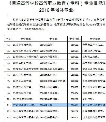 近日,教育部發(fā)布《普通高等學(xué)校高等職業(yè)教育(專科)專業(yè)目錄》2016年增補(bǔ)專業(yè),公布了13個(gè)新增專業(yè),其中包括“電子競(jìng)技運(yùn)動(dòng)與管理”,屬體育類。新增專業(yè)適用于高等職業(yè)學(xué)校,將于2017年實(shí)行。