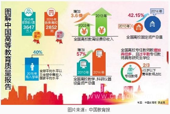 數據顯示,中國高等教育“硬件”建設數量呈井噴式增長,各級各類高校面貌煥然一新。與2003年相比,2013年全國高校教育經費總收入增加了3.6倍。從2010年到2014年底,全國高校固定資產總值增加42.15%,教學、科研儀器設備資產總值增加57%;全國高校專任教師數增加兩倍多,且過半數專任教師具有研究生學位,45歲以下的青年教師占到專任教師總數的三分之二。