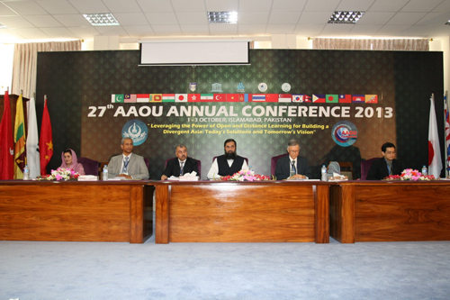 2013年10月1日至3日,第27屆年會在巴基斯坦首都伊斯蘭堡召開,國家開放大學黨委副書記張輝率代表團一行5人出席。 此次年會由巴基斯坦阿拉瑪?伊克巴爾開放大學(AIOU)承辦,主題為:“增強遠程開放教育力量,建設多樣化亞洲——當前方案和未來愿景”。在AAOU全體委員會會議上,中國國家開放大學當選為2014-2016屆AAOU執委會成員。會議期間,巴基斯坦教育部部長、阿拉瑪?伊克巴爾開放大學名譽副校長Baleeghur Rehman同張輝副書記進行了會面,希望兩所開放大學未來能夠開展多領域、多層次合作。