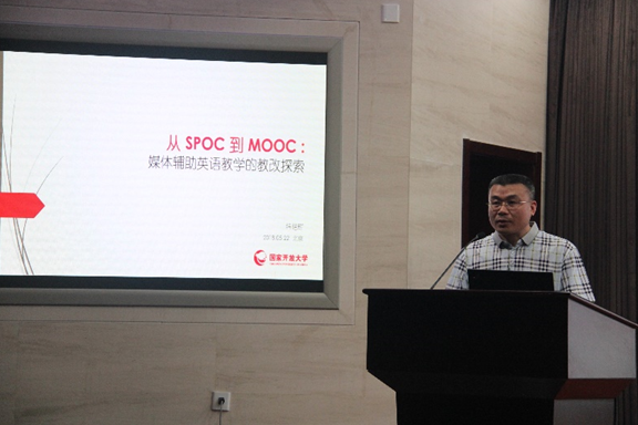韓艷輝以《從SPOC到MOOC:媒體輔助英語教學(xué)的教改探索與反思》為題,介紹了其所承擔(dān)的國家開放大學(xué)《媒體輔助英語教學(xué)》網(wǎng)絡(luò)核心課程的建設(shè)和發(fā)展史,以及該課程在校內(nèi)外所獲得的良好評(píng)價(jià),并重點(diǎn)闡述了該課程成功登陸中國大學(xué)MOOC平臺(tái)過程中的教改探索與反思。