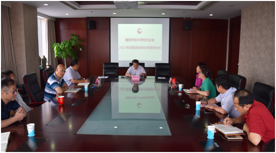2017年6月12日,國家開放大學校辦企業2017年經營目標責任書簽約儀式在五棵松辦公樓1204會議室隆重舉行。學校領導對本次簽約工作給予了高度重視,校長、校國資委主任楊志堅,副書記、校國資委副主任楊孝堂出席會議,見證了各校辦企業2017年經營目標責任書的簽訂。