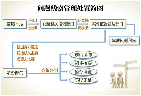 線索處置——指紀(jì)檢機(jī)關(guān)對問題線索進(jìn)行綜合分析,按照談話函詢、初步核實(shí)、暫存待查、予以了結(jié)等方式進(jìn)行處置。