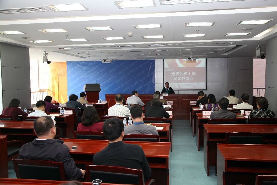 2016年4月21日上午,國家開放大學在五棵松校區舉行了選拔處級干部面試答辯會。在答辯會上,來自學校6個部門的8位競聘人選參加答辯。答辯評委由學校領導班子成員、黨委委員、紀委委員、教代會執委會代表及各競聘崗位所在部門的負責人組成。人事處副處長呂偉萍主持會議。