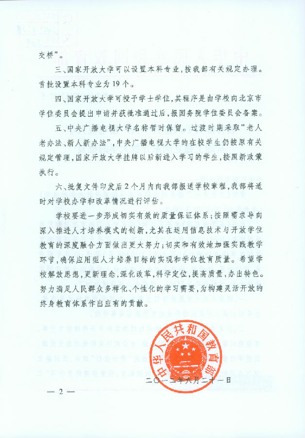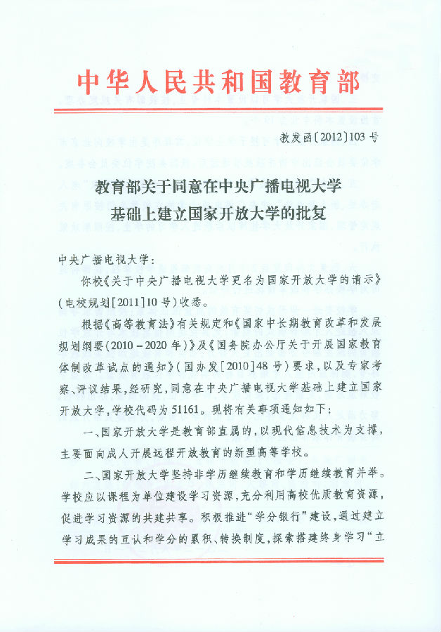 教育部關于同意在中央廣播電視大學基礎上建立國家開放大學的批復